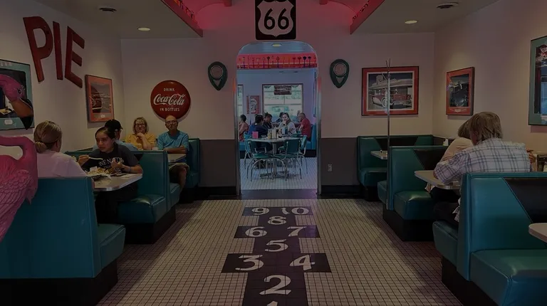This diner was once a gas station. So although not an original Route 66 diner, they have done a wonderful job creating a welcoming, diner/malt shop vibe.Located on a busy city street it's easy to fly by without noticing. We turned on to the side street and into their parking lot. Parking is on three sides of the building from what I saw. We were greeted upon entering and given a choice of seating options. The front has booth and counter seating. More booths and many tables are available in other dining areas. A small room at the back, which was the original automotive bay entrance when this was a garage, would make a good space for a small group (a dozen or so). Restrooms are near the entrance.Our waitress was very good, friendly, asked all the right questions, kept my iced tea and our waters full. We both had burgers and they were good. Fresh lettuce, good amount of toppings. My dining companion had a specialty burger and that big bun helped hold all the toppings in. For my mushroom swiss, the bun to burger ratio seems off. The burgers come with lettuce, tomato, pickles and mustard. You can request some or all of those be removed. The pickles are crisp and have a strong flavor. You have 'sides' options and 'upgrade side' options with the handheld menus. They also have entrees. Lots of chicken dishes and meatloaf.I would love to try one of their milk shakes and pies. So much food. So little time. Whether a local or a tourist this is a nice little diner.