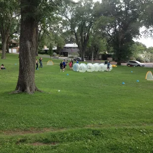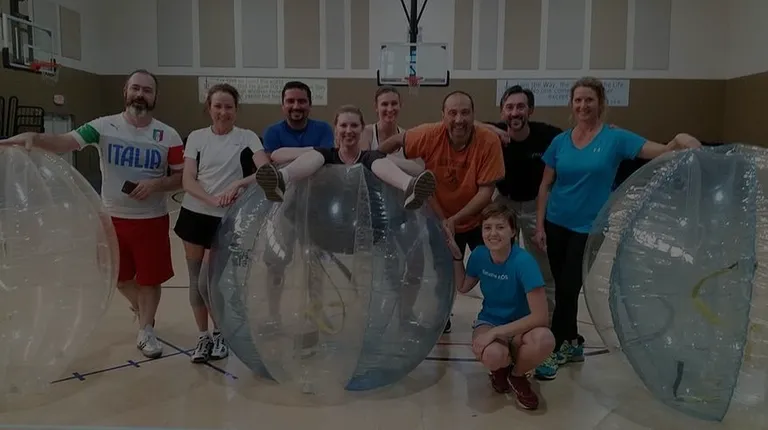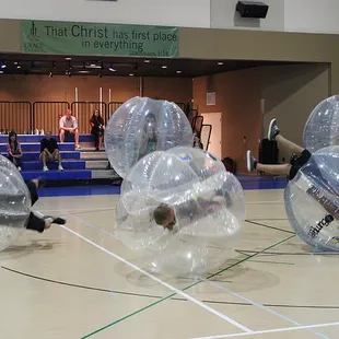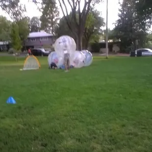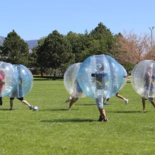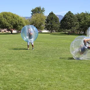 I created the biz page for this company and I think it's important to first note that they don't have a physical address; the address you see on Yelp is for North Domingo Baca Park, which is one of many open spaces where they literally roll. If you want to connect with this awesomeness, simply call or contact 'em via their website. The company is very new to ABQ and they're willing to meet you virtually anywhere, indoor or outdoor, as long as the space is relatively level, I'd say they need about 25 yards of length, 10 yards wide. That's it, people. They handle everything else. They're punctual, friendly, informative, incredibly fun and yeah, you will need to sign a waver because this game is not for the faint of heart and claustrophobes should probably sit it out. So what's it about?The pictures provide decent context, but as a participant, you'll begin by squeezing your torso into a giant plastic orb which straps you in by the shoulders, and you'll grip some handles. The view is exactly what you'd imagine, sort of mottled and trippy (you're staring through a couple layers of lining). After teams have been divvied the 10 minute game is on, and believe me, that's all you'll need for a workout that blends something reminiscent of Jackie Chan's Drunken Master with adolescent futbol, harmless Gladiator glee and an accidental goal or two. Prepare to breathe deeply and take a breather, and if you're a hot-blooded midwestern transplant like me, that cocoon will get sweat-soaked. It's cool, though. The vessels are cleaned between matches.A fantastic team-building exercise, this is perfect for corporate events, birthday parties, ex-lover angst expulsion or silly Yelp gatherings, you can't go wrong with this non-blood sport. And when the game is done, you're not done, yet. There's a "Last Man Standing" closer, wherein everybody slams everybody faux mosh pit style. Sounds like a party? It is. Hardcore. But bouncy.