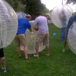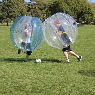 I'd seen Boblefotball (or Bubble Soccer) played by pros on Sports Center. It was hilarious and I rewound the clip a few times to enjoy it repeatedly. Now, I've been that guy in the bubble and it's much easier to see why they looked like drunken clowns out there. It's an all ages blast!... but it's hard to actually "play soccer" as you have in the past. Watching the play, looking for teammates downfield, dribbling and shouting to other teammates: ALL GONE. You will be focused on trying to run with your arms at your chest, trying to find the play and move that way. You will want to run hard, be quick and nimble, but you will not. You will fall and try to think about getting up with no hands. The field will likely be tiny and you'll hear way too many whistles, see lots of balls or no balls and you'll make do. Less whistles, more space and experience will help. The rest is just part of the experience. Ten minutes is plenty. A two minute half-time would give the team a chance to talk, rally and get a game plan. Play without that and it's just a slapstick comedy. Plan on just having fun, sweating a lot in there and laughing at yourself.I look forward to doing it again in December or on an ice cap, where it will be cool in there. I also hope other sports and/or activities to emerge using these fun toys! Bubble-Skiing? Bubble-Boarding? Bubble-Putt-Putt? Bubble-MMA? Bubble-Hockey? Bubble-Gymnastics? Bubble-Weddings? Bubble-Marriage Counseling? The possibilities are endless, funny and thought provoking. PS: ATTN YELP HQ!! There should be a badge for this!