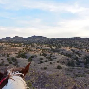 Every time I travel anywhere I try to ride horses. I ride at home so am always looking for my next equine adventure. I've galloped on a Caribbean beach and swam horses in the surf. I've driven cattle in Hawaii, rode through snowcapped Canadian mountains and splashed through Florida rivers. All of those horseback adventures and this, hands down, was the best of the bunch. I saw plenty of reviews for ARA saying how amazing it was but was skeptical. How could the riding be THAT good? Well, I'll tell you. (So much fun that in the one week I was in town I went back to ride THREE times!)Dacodah heads up the operation and is a jack of all trades type. He schedules the trips, drives (and repairs) the truck, leads the tour, shoots HD video while taking pictures, shoes and trains the horses, wrangles the dogs and is an all-around great guy. He was superbly patient in the times I rode with him. He patiently helped tourists get unstuck from the dessert road they had no business even being on. He calmly guides novice riders on the how to (and how not) to ride as well as calmly guiding them through potentially hairy situations. He lavishes love on the horses and the dogs. You start out in a tiny town named San Acacia about an hour south of ABQ. The drive is picturesque so don't let it deter you. You arrive at the old schoolhouse where you meet your mount. Dacodah will ask your riding experience, height and weight to pair you appropriately. Then you head out to your destination. All three times I rode we jumped in the truck for a quick ride into the canyon nearby. We mounted up there and rode for about 3 hours. Ok, so I'm from Florida where the biggest "mountain" we have is the hill leading up from a sinkhole. The terrain at first intimidated me. We took off cantering up (and I mean up!) and down (really, really DOWN!) mountain ridges and canyon ledges. The horses were at times coming down slowly on their haunches, rocks sliding out from under them! We were flying over rocks the size of my head even on the flat areas. It took me about 20 minutes before I started to relax and let go of the back of my saddle. By the end of my first ride I was trusting that my mount (an awesome mare named Stormie, who I rode each time) was sure footed and agile enough to handle the terrain. The views and vistas are absolutely breathtaking! I'll never forget cantering up a mountainside to the top ridge and seeing the sun set over the New Mexico dessert in a rainbow of colors. It is absolutely quiet and peaceful out there with stars like I've never seen. And yes, we started our rides at sunset and finished in the dark. ARA provides water and horse treats on saddle bags as well as there being some drinks and light snacks available at the school house. However, I would recommend bringing a small cooler to keep in your car- you'll get done late and there is NOTHING in San Acacia. By the time we got to ABQ one night everything was closed and we were starving. ARA's horses are fantastic. They will take care of you so trust them. The horses really seem to enjoy themselves, as do the staff (everyone was so nice!) and dogs that always accompanied us. Even my non-riding hubby (who I had to convince to come) enjoyed himself so much when we got back he immediately started planning our next trip to New Mexico so we could ride White Sands. The trip you take is seasonal- we enjoyed the mountain sunset ride but in the summer the river ride is an option and in the cooler months advanced riders can do the White Sands trip. If you want to know more check ARA's website/Facebook page for some awesome HD videos. (ARA GoPro's your entire ride as well as takes pictures which Dacodah puts on a CD for you to keep) But the videos in no way do justice to the sights you'll see and the feelings you'll experience. I wholeheartedly recommend this to any rider of any experience level. There is no better way to see New Mexico, and really, no way to get in the places we did unless you're on horseback.