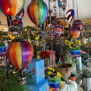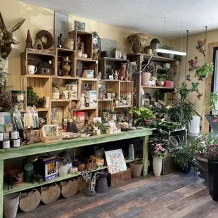 Green plants, blooming plants and fun garden decor.