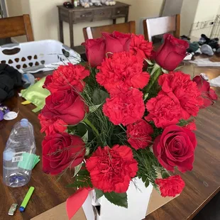 The worst centerpiece by far that I have ordered. (I'm 72 and have ordered many!) I requested few flowers like roses that wouldn't last long & red carnations if necessary for the Christmas table centerpieces (although stating I didn't like carnations (there were a few anemic looking mini white carnations with red rims/horrible!) and preferred red berries, some beautiful Christmas ornaments if possible with greenery & no limit in price but wanted something spectacular. It was to be delivered a week prior to Christmas Day and last over a week, even if a little plucking was necessary.It looked pathetic from the get-go & was mostly dead by 3 days no matter the effort watering it. Absolutely shocking! It was unusable long before Christmas Day. Very disappointing! Hard to believe the $120 arrangement (& willing to pay much more) was so horrible! NEVER use this florist. It looked like a 5 year old designed it!