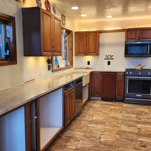 a kitchen with a bar