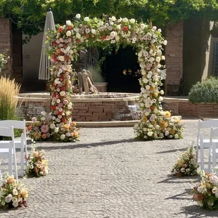 Colorful wedding floral arch at the Four Seasons, Santa Fe.