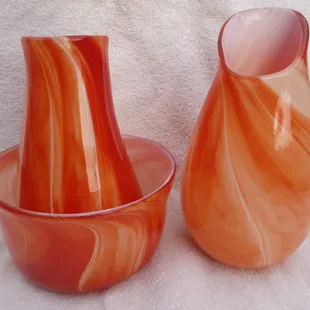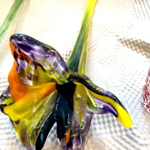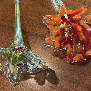 Hand blown glass cups we made in class as well as a glass hot air balloon made by instructor, John. Absolute blast of a time!