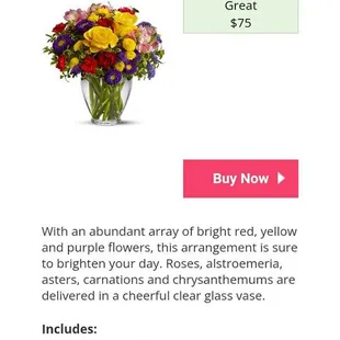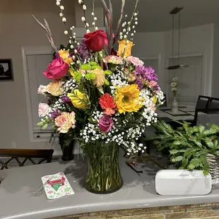 Beautiful arrangement! I was looking for a florist who does exotic/contemporary arrangements, I like something other than a traditional arrangement. I found them online and they had good reviews so I decided to try them and I was not disappointed. The whole process was very easy. I went to their website and everything is done online and it was quick and painless. I made my selection and placed the order and I wanted it delivered the next day. The recipient of the arrangement was so surprised and thought the arrangement was beautiful! He sent me a picture and I was so happy because it looked, actually better, just like the picture they had on their website. I would definitely recommend them when you have a special occasion and need flowers or just go and treat yourself!