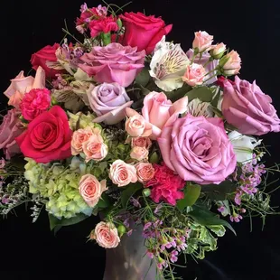 English garden roses, freesia, tea roses, peonies end green hydrangea make this arrangement special.
