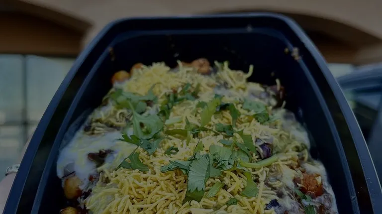 Samosa chaat- partially eaten delicious but looks a hot mess