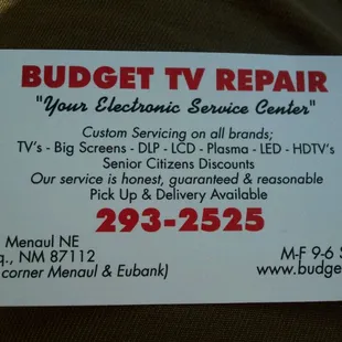 Called as a favor to a family member. While Budget TV did not have the parts we needed, they gave me advice on how to fix the problem, order parts directly so it was cheaper for us with no benefit to them other than just being an honest person. We are small business owners ourselves and know that an honest company in any industry is worth it's weight in gold...and sadly, pretty rare.