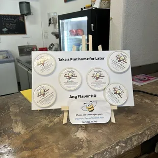 Waffle Cones, Cake Cones, various flavors and special seasoal flavors. Pints to take home and our own Bee Bites Ice cream sandwich!