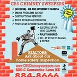 The folks at CBS Chimney Sweepers did an excellent job! Juan arrived on time and quickly set up the work space in the house and then prepared his ladder to climb with his tools. The cleaning was thorough, efficient and very professional. Juan completed the service and cleaned up the workspace, leaving no evidence that he was there. Everything was professional! I would highly recommend CBS Chimney Sweepers!