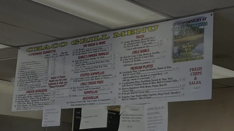 My husband and I live near and rely on Chaco Grill for its very tasty bean & chicharone and barbacoa burritos for lunch as a weekly treat. We also pick up breakfast burritos and rellenos often, and if we are very, very lucky the best tamales ever (not a regular menu feature.)We tend to order, go do our other errands in town and return in 15-20 minutes for pick-up, but calling ahead is a good idea.You can eat in, and they have had an outside area, but its really more of a pick-up and take-away situation - even if you just drive to a pull off with a pretty view and eat in the car, you'll never regret a burrito, or taco, or rellano from the Chaco Grill.