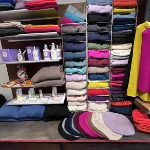 Beautiful cashmere clothing and accessories. I bought a pair of fingerless gloves and scarf. Love this store. Great merchandising and colorful.