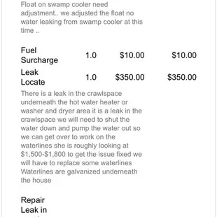 INCREDIBLY DISAPPOINTED - they cost me time and $$$. My water bill told me I had a leak and I called them to investigate. On Tuesday, Mike discovered an issue with the swamp cooler but after I mentioned it was likely bigger than than he discovered a leak in the main water line which took over a section of the crawlspace, messy and muddy like you wouldn't believe. Water was turned off so that they could attempt a repair but they left without giving me an update as to when they'd be back for next steps. I have to call after-hours just after 5 to understand what's next and happening. They then tell me the water will be off for days! I put my tenants into hotels immediately and wait for next steps. I call them Wednesday around 4:30 leaving a message for an update and don't hear back. Thursday, I have to call them (two days later from their initial visit) to see what they say and they mention it's likely still wet and I'm like well let me get dehumidifiers down there. Imagine that! Me trying to trouble shoot with the professionals. They say they have fans so they'll bring them out the next day (they attempted to bring out within the hour but why didn't they do this from day one??) Friday, next day they show up with the two of the most simple fans and I have to laugh thinking you did not have me wait since Tuesday for this. I get Servepro on it with the dehumidifiers which they promise will dry everything out in two days which it does. I let Day and Night know this and they agree to come back the following Tuesday afternoon when I mention everything will be ready for them to work Monday.Come Monday I have TLC come out, quote me, ready to work Tuesday am. When I called TLC I tell you they were understanding concerned for my tenants being out of place, a world of difference when communicating with Michelle. She was nice but between her and the team there was a lack of communication, sense of urgency, and plan to have to work done while I have a hotel bill running daily. For Day and Nights services without any fixed plumbing and my troubleshooting to help them get back in topped $1000, imagine that. I asked several times prior to me canceling them (once I had TLC lined up) about charges and they never mentioned any dollar amount just dating the total would go towards the repair. I wouldn't recommend them to anyone for a big job, just go to folks that will get it done with a plan from the get go. My invoice for work not completed is nearly the cost of the job had it been done BUT it wasn't. How does that make sense? Buyer beware.