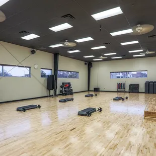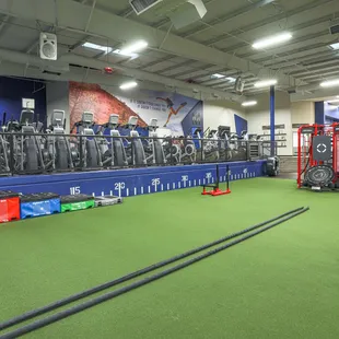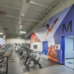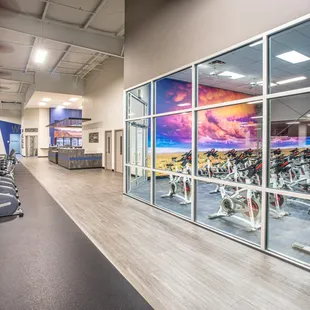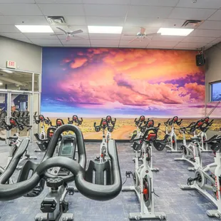 The newly renovated cycling room at Defined Fitness Riverside! Brand new cycle bikes, flooring and wall graphic.