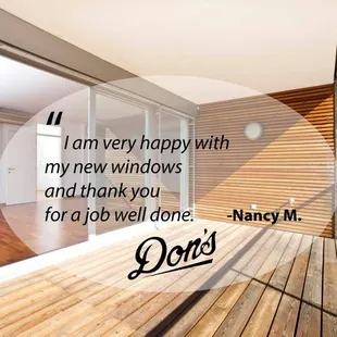 Great experience with Don's Windows. They were prompt both for the quote and installation, everyone was very nice, they left the place very clean, and the windows look great. I'm happy to have replaced the old wood windows with new vinyl ones that are argon filled at altitude to maintain their energy efficiency.We have plans to replace our remaining old window with a door type that they don't make, but we plan to get a tall window put next to it and we will go with Don's again.The only small oops that happened was our bathroom glass should have been clear, not frosted (since we are in the woods and no one lives behind us). They had that corrected within an hour of the initial installers leaving, so not a problem at all. Very pleased with the responsiveness to that one tiny issue.Happy customer here.