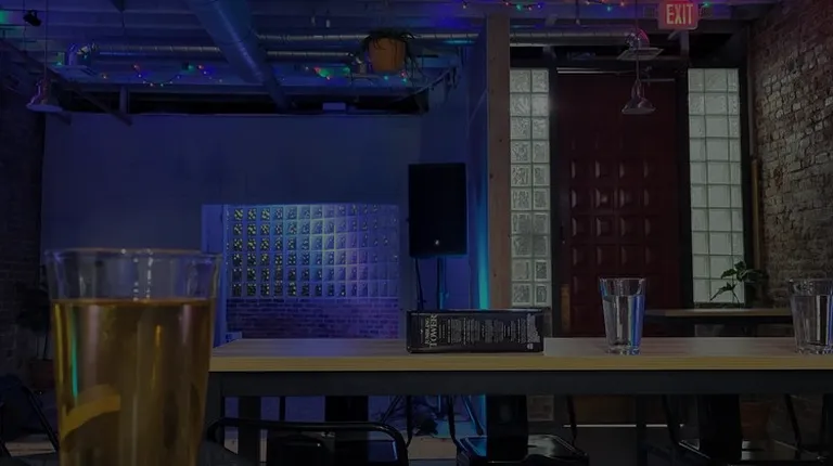 a group of people standing around a long bar