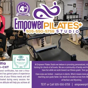 Empower Pilates opened earlier this year with an experienced Pilates owner/instructor behind the helm. Lourdes had a deep back ground in Pilates and Gyro. As someone who has taken Pilates on and off for 15 years, I find this studio to be a relaxed environment for working out. Lourdes consciously varies her workouts each week. Let her know in advance if you are a beginner or experienced and she will steer you to the classes that will best meet your needs. Note: some classes tend to have regulars that are more advanced, but she is always will to provide modifications. Even as someone experienced at Pilates, I had knee surgery and as I was released to do Pilates again, she advised me on which classes to take and provided modifications. With all of his in mind, I find Lourdes to be a wonderful, caring and tremendously knowledgeable instructor and empower Pilates is a clean environment with lots of equipment and small classes (no more than 6 students per class). I highly recommend the location!