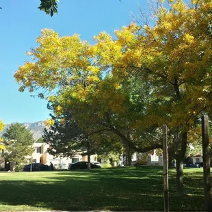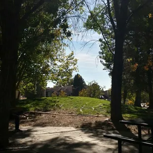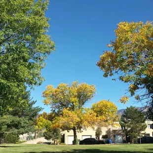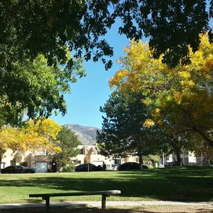 Ernie Taylor is a nice little pocket park next to the Bear Canyon Senior Center. It makes for a pleasant outdoor sit down space for fresh air & conversation on these beautiful autumn days. There are a few picnic tables (expanded metal well coated with vinyl, which is nice), some benches, and a bit of exercise equipment. Plenty of open grass & trees with enough shade to keep the 'Burque sun off if that's what you want. Trash cans for picnic debris and the dog walkers to deposit their little baggies into. No parking lot, but plenty of street parking.