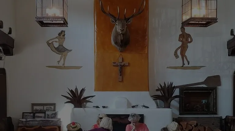 a dining room with deer heads on the wall