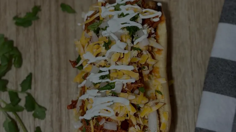 a hot dog with cheese and toppings