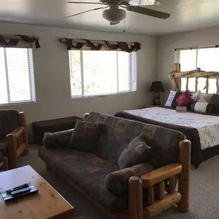 We were thrilled with our visit from the moment we enter the lobby. As we entered Diana and Mike greeted us with a smile and we chatted for quite some time. They are the retired parents of the owner and began managing the lodge a month ago. The lobby itself was very charming and rustic looking just as we had hoped. It was festively decorated with the Christmas theme and the natural log looking banisters and the cozy blazing fireplace set the tone for the weekend with our first step into the lobby. Our bedroom was huge, and everything was sparkling clean. We had a king bed and the bed frame itself was also made of natural looking wood logs. It also had a huge picture window to watch the snow falling outside. We did not get a room with a fireplace but there are several available. The lodge has a couple outside decks for entertaining when the weather is nice, and it gives a great view of the valley below and the mountains in the distance.My wife and I spent a wonderful evening lounging in the lobby and playing cards in front of the fireplace.The next morning, we woke up to a complimentary breakfast prepared by Diana and Mike that included eggs, potatoes, waffles, sausage, coffee, OJ and more. Diana even topped it off with a homemade muffin for my wife's birthday. It was a perfect weekend!!!