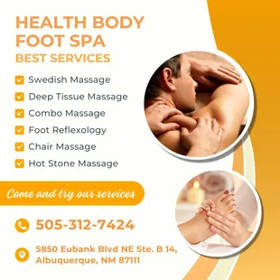 I have now been to Body Foot Spa twice. Both times I got a deep tissue massage. This place is fantastic! It's clean, everything is new, and most importantly, the massage is amazing. Getting a deep massage for my body has helped remove the tension and pain I get from sitting in front of a computer all day. And the hot stones are a must-try! In my opinion, the price is the best you can find for a massage of this quality. I will definitely be coming back to maintain how much better I feel now.