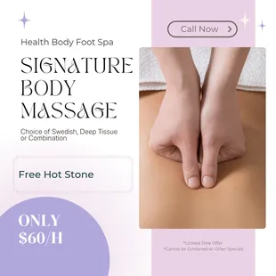 Back is sore and Massage Envy doesn't have weekend opening until August 2023. No worries. COME HERE. Walk-ins welcome. Don't let the modest decor fool you. The massage is worth it. You are paying for the hands not the decor. I recommend a full body one hour. You won't regret it. The rub down is great, but the hot stones and hot towel will take away any aches you have. She is amazing. The great part is you feel better when you walk out of place. I could go skiing I felt so good. Local small business with a great product. They have a promotion right 10 massages the 11th is free. Too freakin cool.