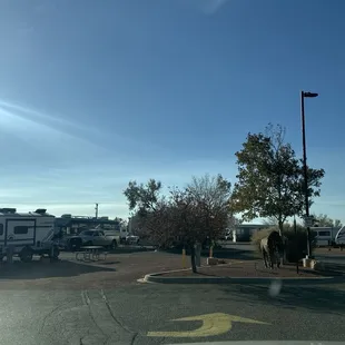 This is certainly desert camping. Located on the edge of Albuquerque. It offers quiet spot to stop in a very secure environment.Restrooms and laundry rooms were spotless and the RV campground offers pet areas and a community area with pool tables to relax if you want to get in and out of the elements. There are a number of long-term campers at this location and discounts are offered for those longer stays. A reasonable rate for a good campground. Located close to petroglyphs national park and route 66 sites. Especially convenient if you are a Breaking Bad fan and you just want to tour the area.There are no fire pits permitted at this location. However, propane and small grills under watch are excepted. The park is small, clean, and offers some really neat sculptures for you to check out. Recommend this RV park if you need a place to stop.