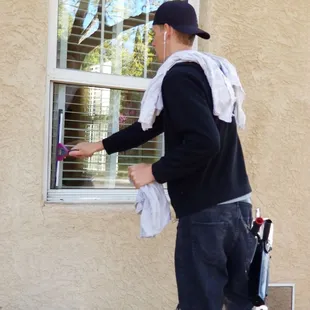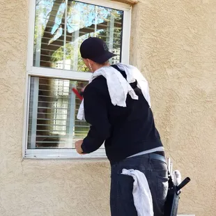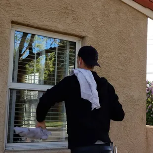 David, the owner, cleaning a client's window