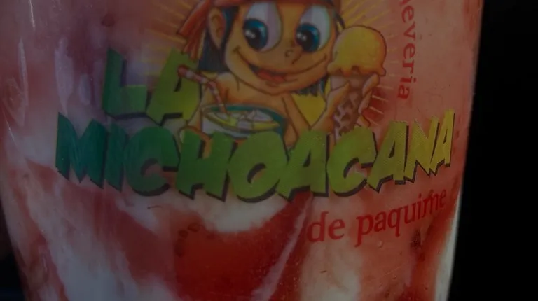 Frozen Blended strawberries with sweetened condensed milk topped with whip cream and more sweetened condensed milk. Fresas congeladas con lechera preparadas con mas lechera y crema batida con mas lechera arriba.