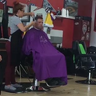 Wow, it's been almost a year since I discovered Alex (aka. Alex van Gogh) and Lucky Thirteen's Barber Studio. I've kept my promise and went back and back and back and back. I first returned in Sept. My pink and purple were fading and I decided that for the fall I should go red! I met with Alex and showed and let her what I was looking for and she found the perfect red for me. And just like that I became a ginger. I loved the color and brightness of my hair. And received lots of compliments on it. So as winter neared my red began to disappear. I texted her my new idea of having candy cane hair, the same color from the fall with blonde highlights. Alex again worked her magic and poof I had hair that was bright and fun. I loved my Candy Cane Hair!Spring came around and again my hair color was fading. I text Alex and and stressed I wanted more highlights to lighten my hair for spring. Once again she delivered exactly what I wanted. She has the amazing gift with hair and hair color. Now summer is here and once again my color has faded. But this time time I saw the beauty of the fade and wanted to live out a childhood dream of having Jem's pink hair. But I also wanted to add some blue for contrast. And what Alex did took my breath away. She not only added pink and blue, but was able to fade in colors to have add some purple and green. And kept the awesome copper tone I had from the red. It turned out better than I expected, and I had high expectations. Alex is a superior artist when it comes to hair color and style. Each time it took around three hours. I couldn't ask for a better place to spend the that time. Staff and costumers are always friendly and made it a pleasant place to hang out. The staff enjoys talking and joking with one another and clearly are having a good time! Most of the customers left happy and are repeat costumers. Thanks, Alex and Lucky Thirteen for making my hair an adventure!