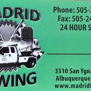 If you are calling a tow truck, you are probably having a bad day. Madrid Towing will make that bad day as good as it possibly can be. My van broke down in Albuquerque on a Saturday evening. I went through several roadside assistance programs to include AAA and no one was available to help. Early Sunday morning, I began calling around and made contact with Madrid who immediately said they would help. They sent out a tow truck that turned out to be too small for my vehicle. The owner showed up and between the owner and the tow truck operator, they were able to get my vehicle moved to a safer location. They explained that they had a larger tow truck, but that driver was off for the day. They texted him and when he heard about my situation, he showed up anyway and within a few minutes, had my vehicle all hooked up and ready to move. Worried about leaving my vehicle overnight at a repair facility that would be closed until Monday morning, they took my vehicle back to their yard and secured it for the night, then met me the next day at the dealership to drop it off. While I hope I never end up broken down in Albuquerque again, if I do, I'll call Madrid. Great service and really, really good people.