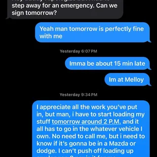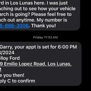 I do not recommend Melloy Ford in the slightest. I already had a truck in the process at another place until one of their sales people called me, so I decided to give this guy a chance and canceled my vehicle I was already in the process of buying. I gave the guy until Wednesday as I'm moving to Idaho Monday. He did well at first. Found a vehicle, got all the stuff done, and then Wednesday came around and he asked if we could push back me picking up the truck because he said "all it needs is to be hit up in detailing" I said yeah no problem Friday works for me. So we set up an appointment for Friday at 6 pm. I live in Las Cruces so it's not a short drive. Friday rolls around and I'm getting ready to leave to head to las lunas on my 2 1/2 hour drive and the salesman messages me and says there's an emergency and asks if we can reschedule for the next day. It's pushing close to my deadline but yeah sure. Saturday comes, I leave las cruces and drive all the way to Melloy Ford where, once again, I had an appointment scheduled to trade in my car and get a truck, i text the salesman and let him know I'll be about 10 min late but heard nothing back. Roll into Melloy ford and the gates are closed, text the salesman, call the salesman and there's no answer. So as I'm fixing to leave to drive another 3 hours back to las cruces, the salesman calls and tells me they closed 30 minutes early and he forgot to tell me. Then he asks if I can give him until Monday, as my truck that i was purchasing needed a new fuel pump and it was in the shop getting one installed. First- nothing was ever said to me about needing a new fuel pump, which isn't a huge deal to me, those things go out it happens, but I was never told about it, so that was being kept from me in. Second- from day one i told this guy i have a new job im starting and i have to leave Monday to move to Idaho, i can not push it back. It was very clear. He asks me to give him until Monday which i reply with I can't, im leaving Monday, that was what we talked about, that was the whole deal with this all. So he said right, I'll get you that truck tomorrow, I'm not gonna make you drive to las lunas again, I'll figure something out and get back to you. This was at 6:30 pm, i drove all the way home, didn't hear from the guy. So i texted him at 9:30 and said "i appreciate all the hard work but i have to pack by 2 pm tomorrow, will i have a truck to pack it into" didn't hear from the guy. It's now 2 pm the next day and haven't heard a word. Their customer service salesmen are horrible. They'll leave you hanging and screw you. Now, my plans are messed up, as i was supposed to pick up a camper on the way to Idaho. Can't do that in a car. And if you think i should have started my truck shopping a long time ago. I started in March, and gave Melloy a chance, I regret it. There's texts and messages to back all this up as well. They don't care about you, they're not honest, and they don't keep appointments. Appreciate it Melloy Ford, you screwed me big time. And Melloy Ford, don't even comment underneath this saying "At Melloy we care about customer service and satisfaction, you should give us a call and figure this out." Because you have made it so stupidly clear you do not care about customer service or satisfaction. Seriously, if you're reading this go to a small buy here pay here lot before you even think of going to Melloy. You'll probably have a better experience. Heck you'd have a better experience buying a vehicle off Facebook. And we all know how terrible that is.