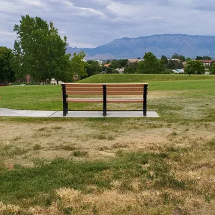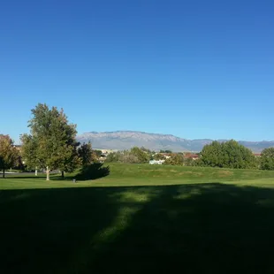 Lovely sprawling green grass park that's dog friendly and has areas of shade with a panoramic view of the Sandias. What more could you ask for?