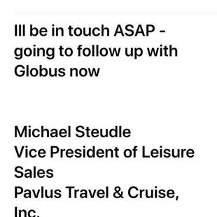 First off, I go to Europe at least twice/year over 30 years, so I'm no novice to travel. I normally take Globus tours, so I know their services well. Pavlus does not provide good customer service in a timely fashion. Agents are usually unavailable during the day of my call, all this working from home crap just isn't working for me. I did, however, get an experienced, knowledgeable, customer service-oriented travel agent on the phone by accident one day, and she was able to get me a terrific flight into Budapest/out of Berlin which my previous agent seemed unable to do. So Trina is to be praised for her help and experience. I probably won't use Pavlus again for many reasons, but if I did, I would definitely call Trina directly. I will probably go through Globus directly, as I have in the past, with a much better customer experience. Sad how customer service means little to so many companies since the pandemic.......