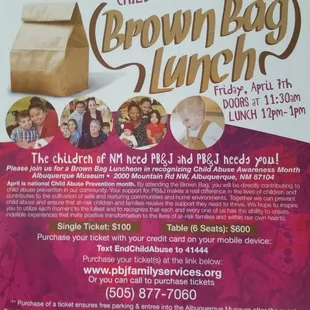Just attended and volunteered at the 6th Annual PB&J Child Abuse Prevention Luncheon Fundraiser. I had not heard of this wonderful organization before, but thanks to Yelp letting me know, I was able to attend and help clean up at the end. I urge other Yelp-era to attend next year. A brown bag lunch was provided with PB&Js, apple, cookie, and chips. This was followed by a nice program including overview of the program, an honor to NM State Rep. Gail Chasey, lawyer and community activist as well as legislator advocating child safety from abuse and neglect. Also, noted speaker Natalie T. shared her story from incarceration to getting on her feet in society. She was heroic and determined to take advantage of the training and resources through PB&J and work to make a better life for herself and her children. She credits PB&J services as being helpful in so many ways and not giving up on her. I'll post a few pictures from this event. Consider supporting this wonderful and effective organization!