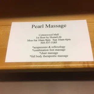 I'm glad I found Pearl massage during my visit there. Came across this place in the mall area. Walked in for a quick foot massage, but it was so relaxing o ended it getting a 90 min full body massage. It was the greatest, all the fatigues are gone, both my cousin and I were very happy with it. Also, very good environment with calm music and clean scent. Love it.