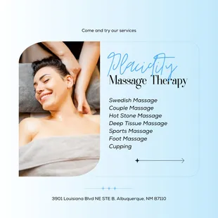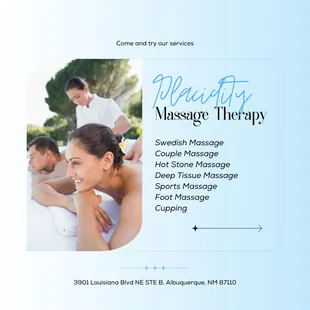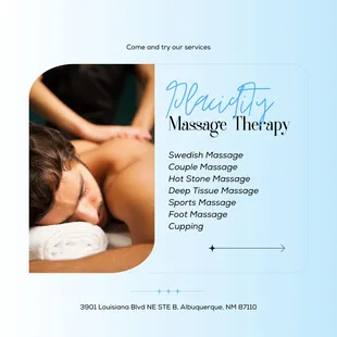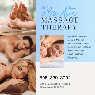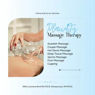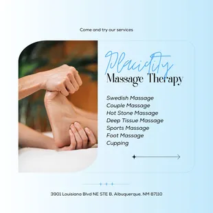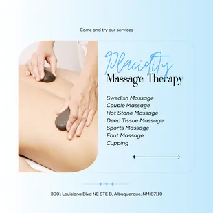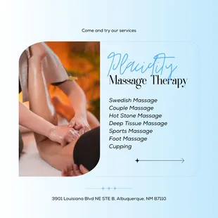 My wife heard about Placidity through Yelp and Google reviews. We decided on a couple's massage for our ninth anniversary. Neither of us have ever had a professional massage in our lives. We visited on a Saturday, April 17, 2022. Earlier in the day, we'd done a body pump class at our local Defined Fitness so we were tired and sore.We booked a one hour massage. Upon entering we were instructed to disrobe and cover up our unmentionables with a white sheet. We hung our clothes up on hooks inside the room. The green room had two massage tables and relaxing music playing. Our masseuses entered the room at exactly 1:00 PM and started our massages on the scalp and neck regions. My masseuse was named Carrie and she asked if I wanted a deep tissue. I said yes, but I would let her know if it hurt too much. Carrie probably weighs a buck fifteen, but she got out all my shoulder knots and used her elbows, knees and hands to really get out all the kinks. She did excellent lower back work and really eased my tired legs. She used hot rocks on my entire body along with hot oil to work out all my soreness. This couldn't have gone any better after a hard workout. My wife and I both left this establishment completely relaxed and feeling great. We paid sixty dollars each and with a tip paid a total of $145. Completely worth every single penny. Placidity will be moving from its current location in 2-3 months due to lease issues. So look for them in their new location soon. Visit them to get rid of all your muscle and joint pain.