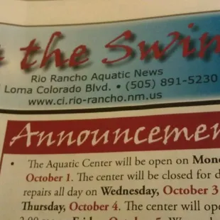 We have been taking my kids to the Rio Rancho Aquatic Center for the past few years. If you have never been here, this center is quite big and offers a big variety of aquatic sport activities from swim lessons, yoga, to a full fledged swim team. Check out the attached schedule I pulled from their website: https://rrnm.gov/3887/Spring-2019-Brochure. Entering the center, you immediately arrive at the front desk, where a staff member is always available to help with questions you might have. The men's and women's locker rooms are separated nicely for privacy. From what I have seen of the men's locker room, there are many lockers to choose from, you'll just need your own lock. The room appears to be cleaned regularly. Sorry, I don't have insight into the ladies lockers, but my wife and daughter have used them and have never said anything negative. They also have family restrooms if needed. To get to the pool area, you can go from the main lobby or the locker room areas. There are technically two very large pools. The one to the left is usually used by beginning swimmers, but has lanes for lap swimming too. The one on the right is primarily used for competitions by the swim team but has lanes for laps too. The water is always quite clear and you can tell the water filtration system works consistently well. The temperature inside usually feels quite balmy. The life guards are excellent. They have one at each pool and rotate quite frequently. They are always looking out for the guests, never on their phone or chatting with each other. This is definitely a great place for those that enjoy water activities or want to learn how to swim. Come check it out!