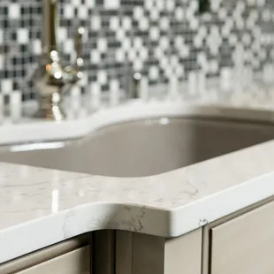 Beautiful! Elegant! Modern! Cambria Brittanicca Quartz Custom Countertops with Waterfall Edge.