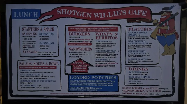 Good place in Red River for breakfast. Food is always good and the service pretty quick even when busy. Have a good burger for lunch if you want something tasty and quick. Always make it by Shotgun Willie's every trip to Red River.