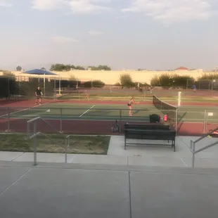 Two years in, a solid three stars for tennis instruction at this complex.First, a couple of basics to get out of the way. I want to say there are maybe 12 courts, very well maintained, most have shaded benches, power outlets available, and score keepers for match play. They host tournaments and often you'll encounter a bunch of people livin' the good retired life, hanging out, sometimes hosting a pot luck. Like the pool next door, this is a great community facility in the summertime, for young and old alike.Concerning the instruction: This complex is the recipient of a USTA grant for beginning players, and it's a cool program; students begin on a tiny court and slowly graduate to bigger nets and bouncier balls, ultimately finishing in Skilled. And because they're employing teenagers, that's the quality of the coaching -- I know all about it, I once taught, when I was that age. As a parent, I'll only suggest to watch carefully. We've had some terrific coaches, some lackadaisical, and seen management that contributes to both. Don't hesitate to bring up your issues with the front desk, so far, ours have been addressed. Hey, the classes are dirt cheap, the facilities and equipment are good (they have a ton of loaner rackets and balls), overall, can't complain.