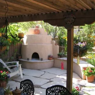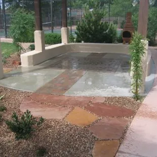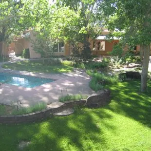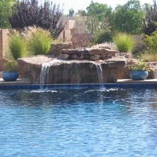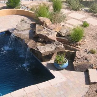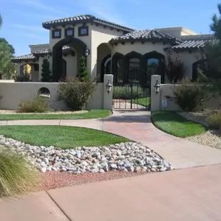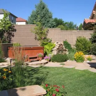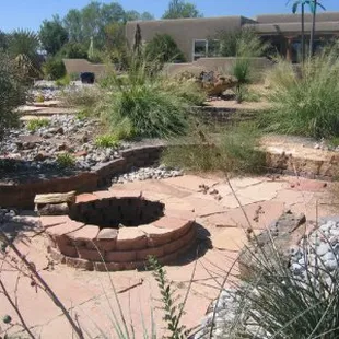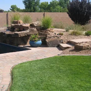 Fountain, grass, plants, lighting, walkway, fence, fireplace, drip watering system all installed by Sunbelt Landscaping