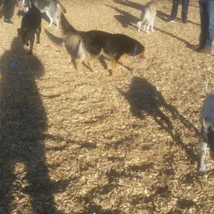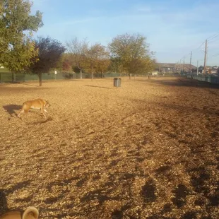 Good size dog park but short on variety. It's mostly a huge, rectangular area covered in wood chip. There is a separate area for dogs under 25 lbs. but most dogs in all sizes are in the main area. There are courtesy poop bag stations and trash cans as well as a water spout for public use.