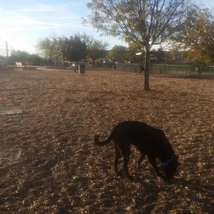 Let me tell you why I love this park so much....the Mon-Fri 7am-9am group of dogs & their owners are one-of-a-kind-wonderful in every way. There are other cool dog parks around town, but this one has a looooooooooooong area for my dog to run and run and run and run. The wood chips don't bother me, or my dog, and I seriously look forward to my morning visits to hang with "the crew" - Just an exceptional group of people with amazing dogs who love to play with other dogs. They run each other out, wrestle each other to oblivion, and it's just completely made the whole experience for me. It's great to be around people who "get" dogs, and don't feel any anxiety about letting their dogs be dogs with other dogs. They look out for each other, and each other's dogs. And while I'm raving about the crowd more than the details of the park itself, it's just because it really seals the deal for me. They are regulars every day all year long and this is their stompin' grounds. Happy to be a part of it. It would be nice if the city left the water on a little longer, but other than that, I see staff replacing trash bags daily, and bringing in fresh wood chips often enough.