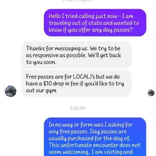 My first encounter was not so well, it's sad that they receive visitors like this. I've been a gym member in my home state for over 3 years and I expect fees when traveling to local gyms. Never did I ask for anything free. This was just so sad. And I am moving to town soon also this was just unwelcoming, am I overreacting?