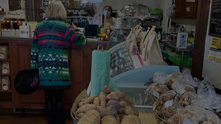Coffee shop with local sodas & kombucha, plus honey, teas, eggs, dairy, flour, meat, veggies and more