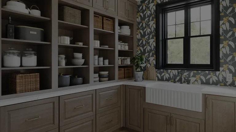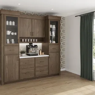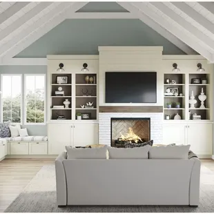 A cozy living room featuring painted vanilla cabinetry, open shelving, and a fireplace creates a warm and inviting atmosphere!