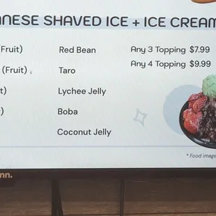 They have a bunch of signs with shaved ice and shaved snow but when we asked for the shaved ice menu, she just said ok go sit down and wait. We wanted snow, not ice. Not snow cone style but real shaved snow like in their images. So we didn't know what was going on, we waited, and she made us a random shaved ice without asking. It ended up being a rainbow of everything they have in stock lol it's snow cone type of ice (no good) with sugar syrup like a snow cone. Not shaved snow like we wanted at all. We got green, yellow, pink and I dont know what else. Too many flavors. Then topped with many jellies, popping boba, fruit and 3 flavors of ice cream. $7 total. All too much too many flavors it didn't fit. Wouldn't get again, but it looked very very pretty.
